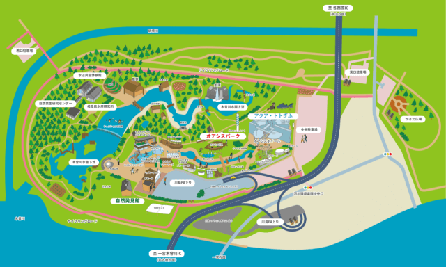 「河川環境楽園」は、オアシスパークを含む公園全体の通称です。