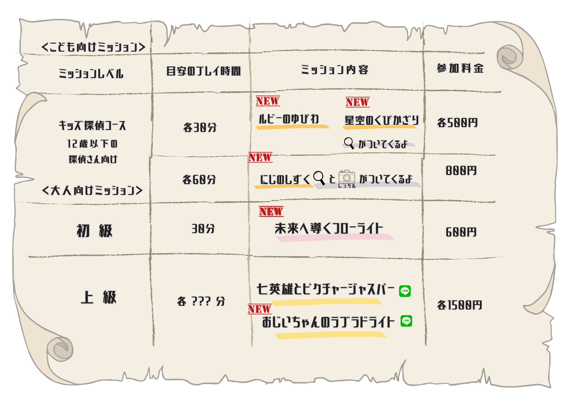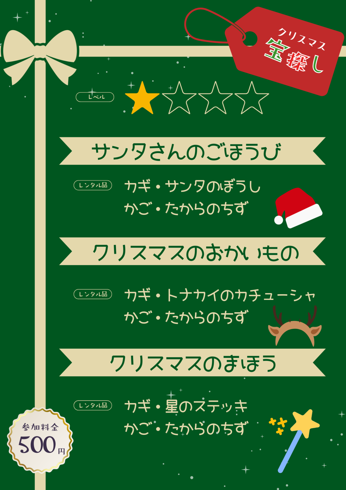 | 注意事項 | ※答え合わせ及び備品の返却は17:50迄となります。 ※6歳以下のお子さま及び自立歩行が困難な方は16歳以上の保護者の方と一緒にご利用ください。 |